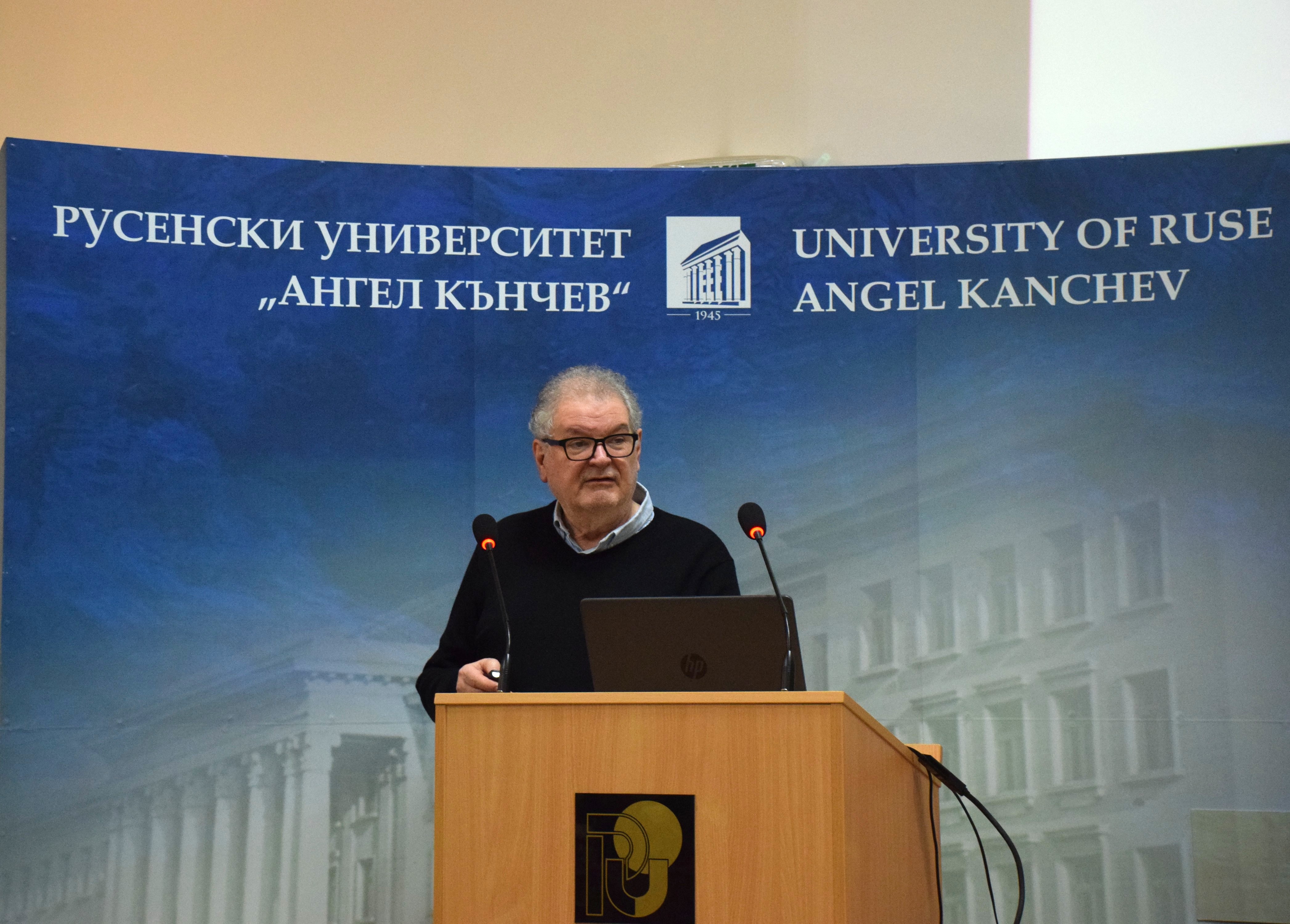 After the ceremonial awarding, the honorary doctor was given the floor for an academic speech. He expressed gratitude to the academic community of the University of Ruse for the recognition and high appreciation for his work and that of his colleagues in it. He expressed his confidence that the excellent cooperation between the University of Ruse and the Naval Academy "Mircea cel Batran", Constance, Romania will continue in the future.