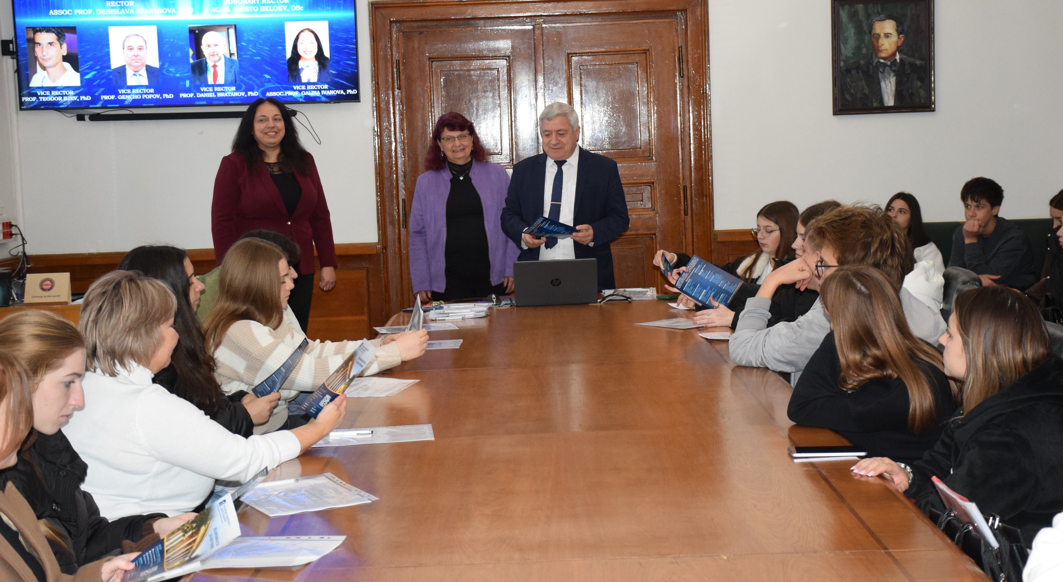 Professor Gencho Popov, PhD presented the university and its activities, informing the guests about the participation of the higher education institution in international projects, about the good experience gained in them, about the many international agreements concluded under the Erasmus program, as well as about the increase in the number of students from France coming annually under the program.